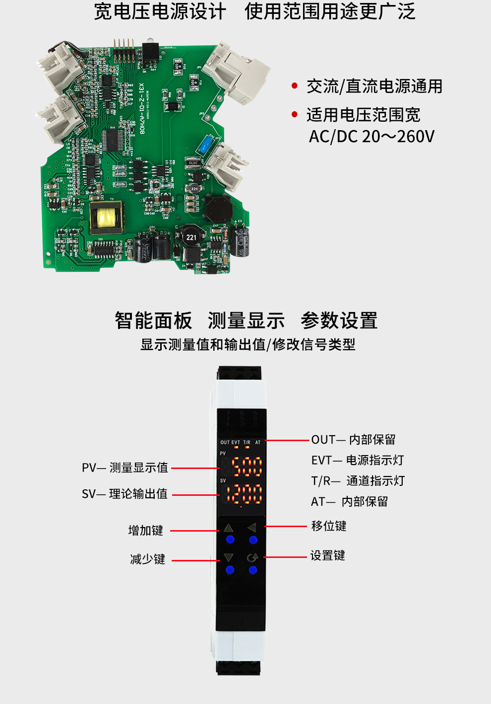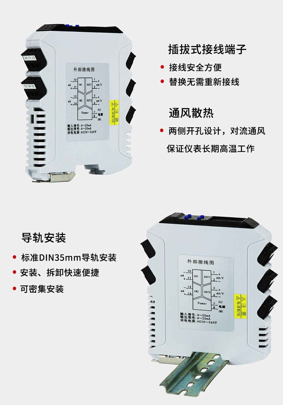 OHR-X31系列導軌式智能隔離器將現場的直流電壓或電流信號經過隔離傳送,轉換成所需的信號給其它儀表。可以與DCS、PLC等系統配套使用,從而提高工業(yè)生產過程自動控制系統的抗干擾能力,保證系統的穩(wěn)定性和可靠性。寬電源設計:20-260V交直流供電。配置高清顯示單元,通過輕觸按鍵設置每個通道的參數及通道之間的切換。高抗干擾、穩(wěn)定性好、可帶RS485通訊
