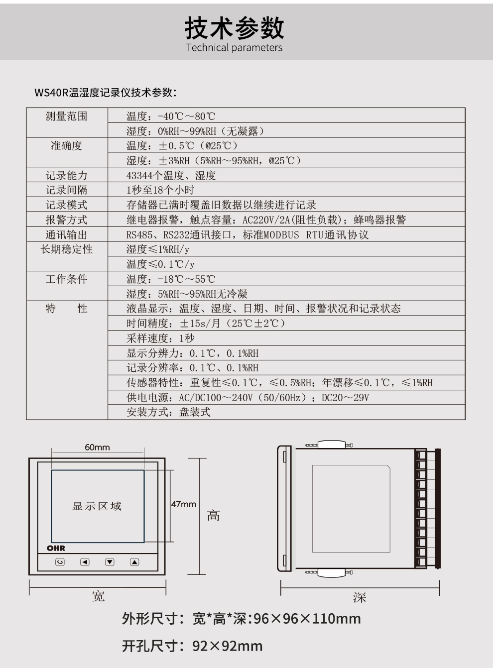 • OHR-WS40R系列盤裝式溫濕度記錄儀采用高精度的采集電路及進口傳感器,對環境的溫濕度進行實時監測、報警與記錄。大屏幕液晶顯示器,實時顯示溫濕度、時間與記錄信息;帶串行通訊接口,實現數據通訊;通過配套的上位機軟件可查看數據詳情。該記錄儀主要用于監測記錄食品、醫藥品、化學用品等產品在存儲過程中的溫濕度數據,廣泛應用于倉儲、冷藏庫、實驗室、養殖孵化、大棚種植等。