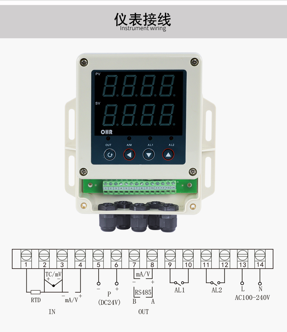 控制類儀表的配電是指:專為2線制變送器供電的電源,通常+端為24V輸出端,-端為信號采 集端;其24V的-端與信號采集的-端在儀表內部短接。饋電:饋電與輸入信號之間完全隔離,4線制傳感器普遍要求輸出與電源之間需要隔離,所以使用饋電連接;饋電的24V-端也可與輸入信號的負端短接實現與2、3線制變送器的連接。虹潤公司儀表的配電與饋電的負載能力當訂的為同款儀表,其負載能力相同,一般為30mA。